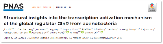 2023年5月23日,南京中醫(yī)藥大學(xué)醫(yī)學(xué)院﹒整合醫(yī)學(xué)學(xué)院,附屬鼓樓臨床醫(yī)學(xué)院林煒教授課題組和浙江大學(xué)馮鈺教授團(tuán)隊(duì)、中國科學(xué)院分子植物卓越創(chuàng)新中心趙國屏院士團(tuán)隊(duì)以及中國科學(xué)院物理所王爽研究員團(tuán)隊(duì)在國際著名期刊美國科學(xué)院院刊Proceedings of the National Academy of Sciences of the United States of America(中科院一區(qū),IF:12.779)上發(fā)表了題為“Structural insights into the transcription activation mechanism of the global regulator GlnR from actinobacteria”的研究成果。該研究捕獲了結(jié)核分枝桿菌GlnR依賴型基因轉(zhuǎn)錄激活復(fù)合物結(jié)構(gòu),揭示了全局性轉(zhuǎn)錄調(diào)控蛋白GlnR選擇性調(diào)控基因轉(zhuǎn)錄的分子機(jī)制,為全面認(rèn)識結(jié)核分枝桿菌和整個放線菌的代謝調(diào)控機(jī)制奠定了基礎(chǔ)。該工作是林煒教授團(tuán)隊(duì)繼Mol. Cell(2017, 2018)、Nat Commun(2019)、Nucleic Acids Res(2020, 2021, 2022a, 2022b)之后在病原菌基因轉(zhuǎn)錄調(diào)控機(jī)制研究和新型抗耐藥菌藥物靶點(diǎn)發(fā)現(xiàn)領(lǐng)域取得的又一項(xiàng)全新研究成果。