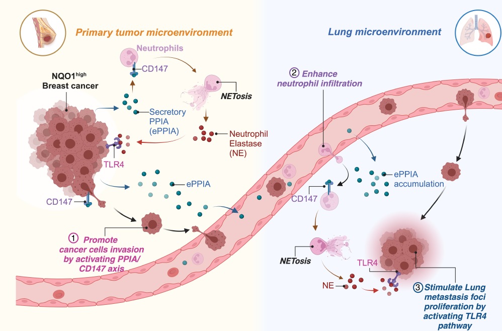 乳腺癌肺部轉移是患者死亡的主要原因之一,因此迫切需要開發新的靶標和療法來預防和治療這種轉移。該研究創新性地揭示了NAD(P)H:醌氧化還原酶1(NQO1)在乳腺癌肺轉移中的調控機制。研究發現,NQO1通過抑制親環素A(PPIA)在關鍵半胱氨酸殘基C161處的氧化,穩定并上調了其在乳腺癌細胞中的表達。PPIA激活了促進細胞侵襲的CD147通路,誘導惡性乳腺癌細胞的侵襲。此外,NQO1通過誘導PPIA的胞外分泌,調節了原發和肺轉移部位的免疫環境。NQO1高表達的乳腺癌細胞分泌的PPIA與中性粒細胞上的CD147結合,促進了肺部和腫瘤處中性粒細胞的浸潤,并觸發了中性粒細胞外陷阱(NET)的生成和中性粒細胞彈性蛋白酶(NE)的釋放,形成免疫抑制的微環境,促進了腫瘤侵襲和肺部定植。進一步研究發現,藥物靶向PPIA可以有效抑制NQO1介導的乳腺癌肺轉移。綜上,該研究揭示了一個未被認識的驅動乳腺癌肺轉移的NQO1-PPIA-CD147-NET軸,抑制這一軸是限制乳腺癌患者肺轉移的潛在治療策略。