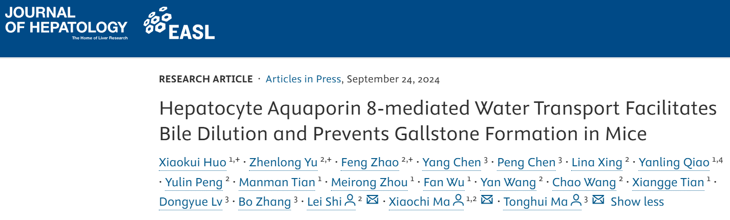 2024年9月24日,我校藥學院麻彤輝教授課題組與大連醫科大學馬驍馳教授課題組在肝臟研究領域頂刊Journal of Hepatology(IF=26.8)在線發表題為“Hepatocyte Aquaporin 8-mediated Water Transport Facilitates Bile Dilution and Prevents Gallstone Formation in Mice”的研究論文,該研究發現肝細胞毛細膽管膜水通道蛋白AQP8高效介導水轉運的分子機制,可促進小鼠膽汁稀釋和防止膽結石形成;通過構建AQP8調控的高通量篩選體系,對中醫治療膽結石的20種常用“利膽”中藥進行篩選,從中藥燈盞細辛中分離出藥效活性小分子-野黃芩苷(Scutellarin)。體外研究表明,野黃芩苷顯著上調原代培養肝細胞AQP8 mRNA和蛋白表達。體內研究顯示野黃芩苷顯著增加膽汁流量,降低膽汁中膽固醇、膽汁酸和磷脂等脂質濃度,并阻止高脂飼料誘導的膽固醇結石形成,而對AQP8-/-小鼠無明顯影響。分子機制研究表明,野黃芩苷通過抑制AQP8的轉錄負調控因子HIF-1α與HSP90的相互作用,促進了HIF-1α的泛素化降解,從而上調AQP8基因表達,促進膽汁分泌,發揮利膽作用。