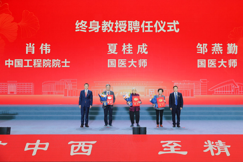 大會期間,學校授予國醫(yī)大師夏桂成教授、國醫(yī)大師鄒燕勤教授、中國工程院院士肖偉教授為南京中醫(yī)藥大學終身教授,以表彰他們?yōu)辄h育人、為國育才的至誠情懷,甘為人梯、無私奉獻的高尚師德,敬佑生命、救死扶傷的醫(yī)者仁心,勇攀高峰、追求卓越的開拓精神。會上,黨委書記喬學斌、校長程海波共同為三位教授頒發(fā)終身教授聘書。