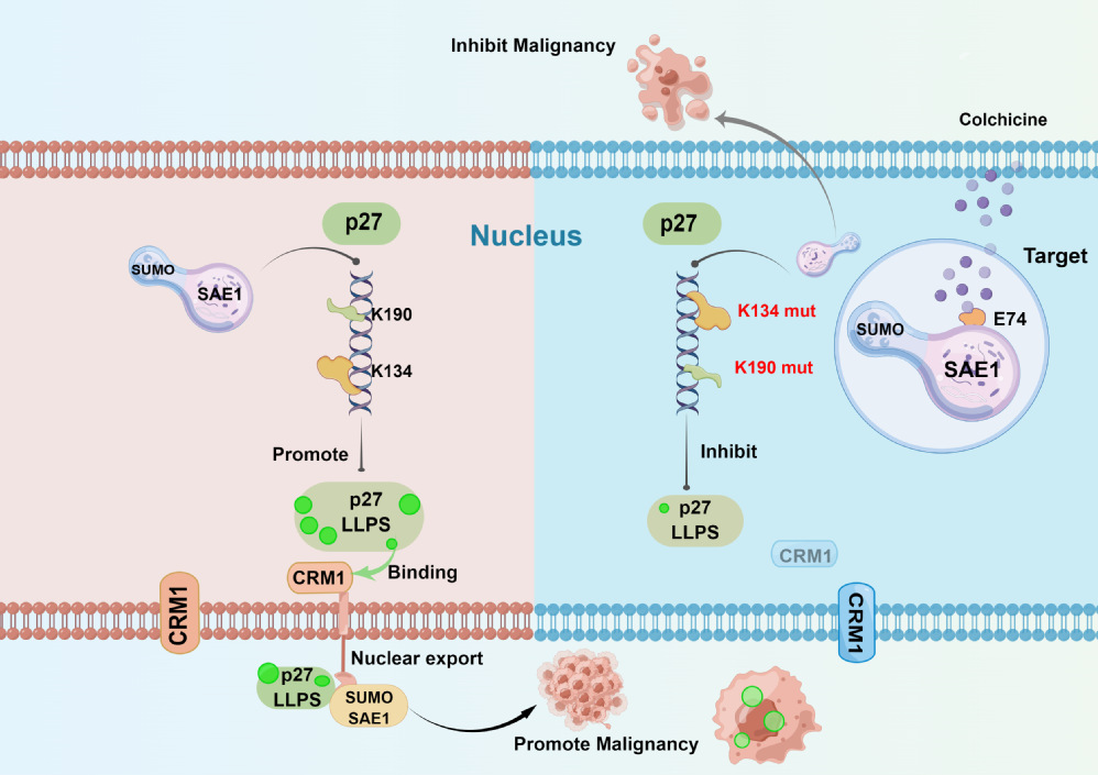 本研究基于"以毒攻毒"的中醫理論,系統探究了秋水仙素和秋水仙堿抗MM的作用,并利用Cy5標記的秋水仙來源天然化合物探針進行人蛋白質組微陣列篩選,發現潛在MM靶點——SAE1(SUMO1-activating enzyme subunit 1)。進一步深入機制研究發現,SAE1不僅可以SUMO化修飾p27的K134和K190位點從而增強p27的液液相分離(LLPS),還對“經典抑癌基因”p27在細胞核內外的定位產生重要影響,SUMO化誘導的p27核輸出可以促進MM細胞惡性增殖,揭示了PTMs在內在紊亂蛋白相變中的潛在作用機制和功能重要性。研究結果表明,秋水仙堿可以靶向SAE1從而破壞p27的SUMO化,在多種癌癥的體內外實驗中呈現出優異的抗癌作用。