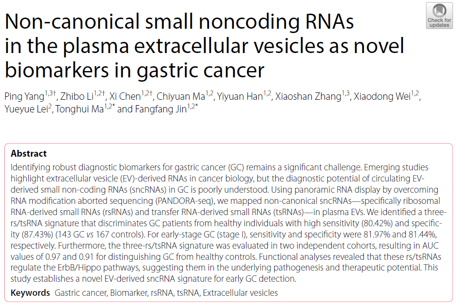 2025年4月3日,國際知名學術期刊Journal of Hematology & Oncology(中科院醫學一區,IF=29.9)在線發表了我校麻彤輝教授、金芳芳副教授團隊的最新研究成果:Non-canonical small noncoding RNAs in the plasma extracellular vesicles as novel biomarkers in gastric cancer。