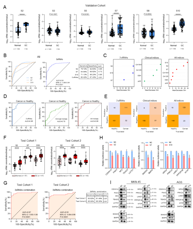 麻彤輝教授團隊利用克服RNA修飾干擾的PANDORA-seq全景測序技術,首次在血漿外泌體中系統分析了兩類非經典小RNA——rsRNA和tsRNA的分子圖譜。研究發現,由3種rs/tsRNA組成的分子組合在早期胃癌中表現出優異診斷效能。機制研究顯示,這些rs/tsRNA通過調控ErbB/Hippo信號通路參與胃癌進展,為診斷標志物提供了理論依據和潛在治療靶點。本研究首次建立了基于外泌體來源的非經典sncRNAs的胃癌早期診斷模型,為液體活檢提供了新思路。